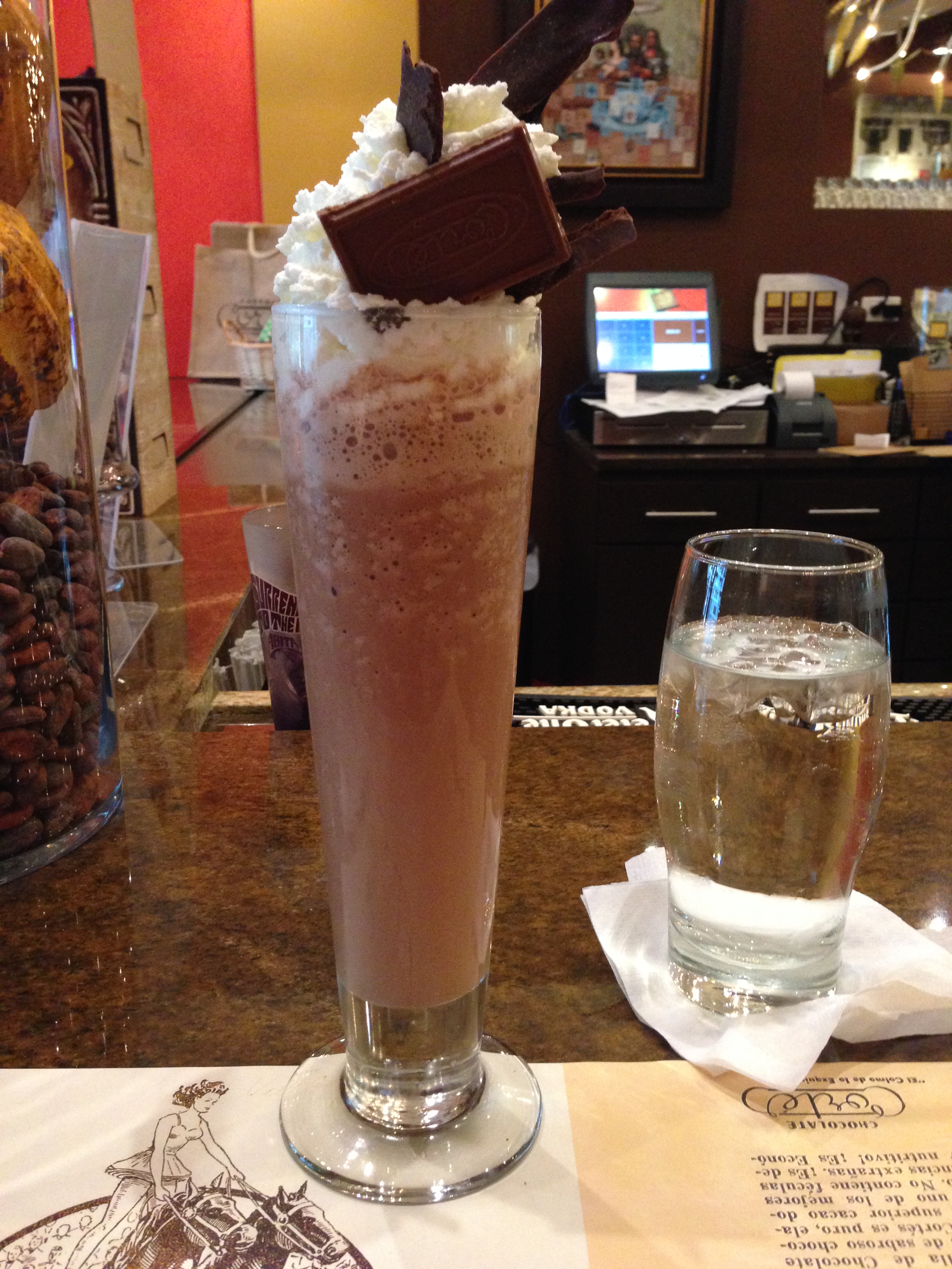 We sat at the bar and were immediately given small samples of hot chocolate. Rich and creamy, it was amazing, but since it was 90 degrees out, I wanted something cool. I ordered the chocolate frio, (cold chocolate). The tall, cold glass filled with sweet liquid chocolate, a frothy tower of whipped cream, and a chunk of chocolate which was placed on top as if it were the bride and groom on a wedding cake.