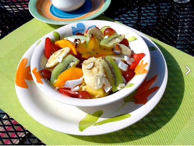 The coffee is freshly ground, my favorite on the island. The generous fresh fruit bowl is a masterpiece of color, flavor, and freshness. Local-bananas, mangos, and pineapple, picked from the garden behind the restaurant are the stars. A drizzle of ginger honey sauce on top compliments the fruit perfectly.