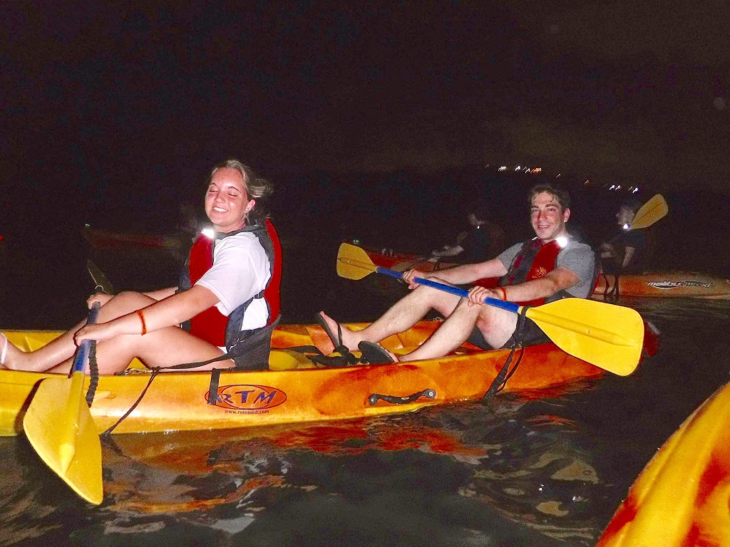 The tour leader will review safety procedures and paddling techniques and your group will enter a hidden opening in the mangroves by kayak off the end of the beach. For the one mile trip through the dark and ominous mangrove forest, the parade of kayakers follow one another, guided only by the lights on the front and back of the boat. An iridescent blue glow will surround the paddle as you gently move it through the water. We got to see the outline of a large manta ray as it floated below, as if it were a cloud casting a shadow.