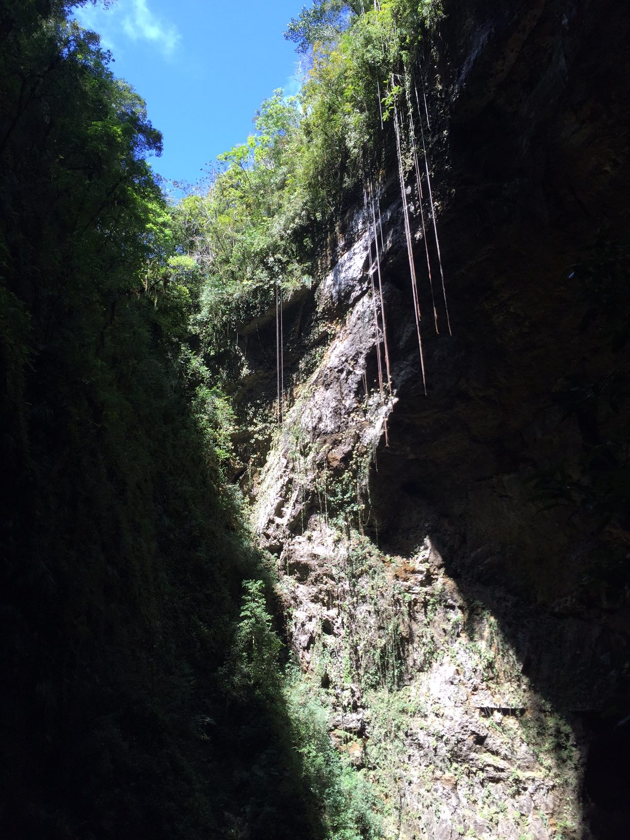 The cavern opens into an area where the Camuy River runs into the subterranean waterway.  A sinkhole from above gives view to the vegetation hanging into the cave-like long thin fingers hanging down from a hand.  The gentle tweets of birds, as they fly between the opening, gives a peaceful connection between light and life above, to the darkness below.